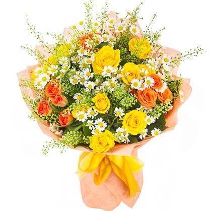 Шикарная композиция из желтых и оранжевых кустовых роз, дополненных полевыми ромашками и декоративной зеленью, непременно поднимет настроение даже в холодный и пасмурный день, а также напомнит получателю о ваших чувствах.